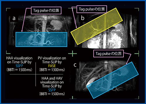 c:Tag pulseを図の位置に設定し,SSFP法にて収集することにより,肝動脈および肝静脈などが良好に描出できる。