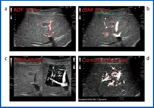 また,図2の膵神経内分泌腫瘍(膵NET)の肝転移症例では,ADF(図2 a)において腫瘍血管の同定が困難であったが,mSMI(図2 c)は腫瘍内に流入する血管の構築が描出できており,多血性腫瘍であることがわかる。ただし,心拍動によるモーションアーチファクトが出ているため造影SMI(図2 d)を行ったところ,非常に鮮明な腫瘍血管像を得ることができた。