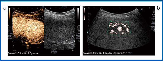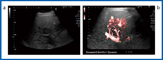a:造影超音波 b:造影SMI