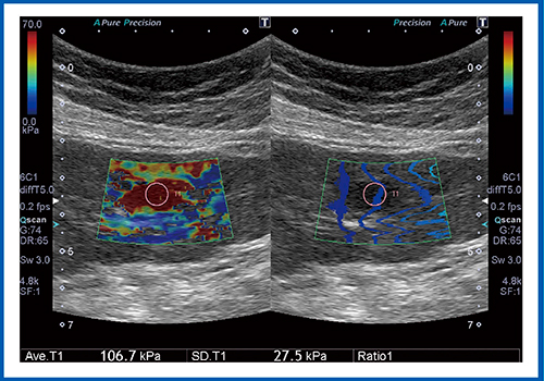 図8は,肝血管腫の症例である。赤く表示されている結節の弾性率は109.1kPaとなっており,値だけを見ると悪性腫瘍が疑われるが,ほかの画像も併せて読影することで,肝血管腫であると診断できた。
