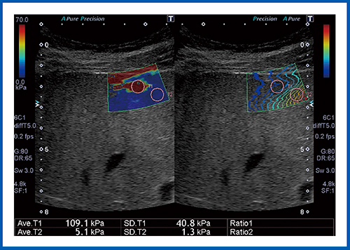 エラストグラフィは,strain imagingとshear wave imagingの2つに大別される。励起法としては,用手的加圧を行うmanual compression,音響放射圧を用いるacoustic radiation force impulse,機械的に振動を与えるmechanical vibration and impulseがあり,東芝メディカルシステムズ社のSWEはacoustic radiation force impulseを用いている。SWEの原理は,プッシュパルスで組織内部に剪断波を発生させて,剪断波が伝播していく速度をドプラパルスで計測し,弾性率を算出する。さらに,特長としては,剪断波の発生から伝播していく経過を1枚の静止画で信頼性高く観察できる“到達時間等高線表示”ができることが挙げられる。SWEは,正常肝の場合,剪断波が均一に伝播していくが,肝硬変など組織の硬い部分は伝播が速くなり,赤色で表示される。このことからSWEは,びまん性肝疾患,特に肝線維化診断において有用である。