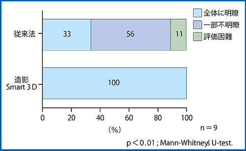 (1) 造影Smart 3Dの血流診断能,(2) 造影Smart 3Dの血管描画性,(3) 造影Smart 3Dによる治療効果判定であり,(1),(2)は従来法と比較し,(3)は造影2Dを用いたDefect Re-perfusion Imaging(DRP)2)と比較検討した。その結果,22結節すべてで造影Smart 3Dによる血流評価は可能と判定された。このうち,未治療の5結節について非造影Smart 3Dと血流検出率を比較した結果,非造影の血流検出率20%に対し,造影Smart 3Dでは100%と,造影後明らかに血流検出率は向上した。また,従来法との比較では,血流診断能に差は認めず,血管描画性については造影Smart 3Dの方が有意に優れているという結果を得た(図4)。