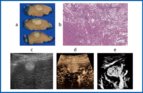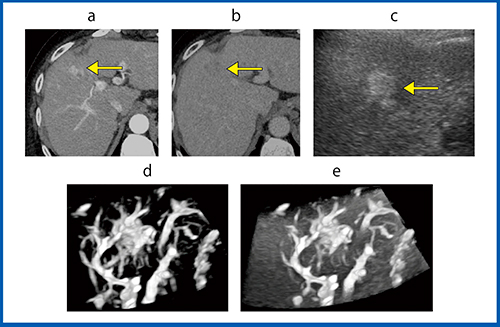 実際の症例を提示する。図5は,C型肝硬変に合併したS4,20mmのDEB-TACE施行後のHCC症例である。造影CT(図5 a,b:は腫瘍部)では不整な濃染像と染まり抜けを認め,HCC再発と診断された。Bモード(図5 c)では内部エコーレベルの高い腫瘍として同定された。造影Smart 3D(図5 d, e)では,不整な腫瘍血管と既存の脈管構造が明瞭に描出され,腫瘍の全体像のみならず腫瘍と脈管の位置関係まで明確にすることができた。
