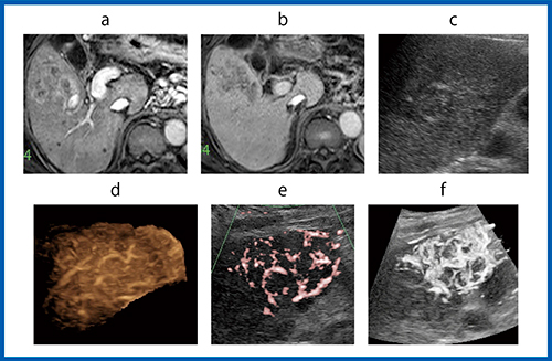 図6は,NASH肝硬変に合併したS5, 52mmのHCC症例である。EOB造影MRI(図6 a,b)では,不整な濃染形態を示し,多結節癒合型HCCと診断された。Bモード(図6 c)では,腫瘍内に高エコー領域を伴った境界不明瞭な腫瘍として描出された。従来法の造影3D(図6 d)では組織シグナルの影響により腫瘍内血管は不明瞭であったが,造影SMI(図6 e)では腫瘍内血管は明瞭に描出され,造影Smart 3D(図6 f)では腫瘍血管の連続性が向上し,HCCに特徴的なNetwork pattern(網目状の腫瘍内血管像)を呈した。
