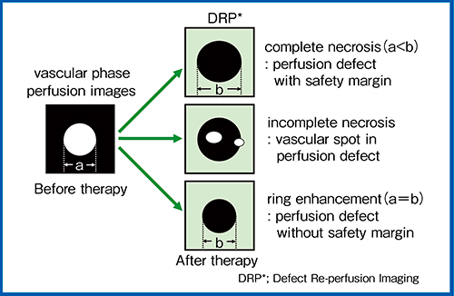 当院では,肝癌局所療法の治療効果判定にDRPを用いて評価を行っている。図9に,その判定基準を示す。このうち,治療前の腫瘍径が治療後のdefect径を上回り,かつDRP陰性の場合は完全壊死と判定し治療終了,DRP陽性の場合は不完全壊死とし追加治療を行っている。また,治療前の腫瘍径が治療後のdefect径と同等かつDRP陰性の場合,リング状濃染と判定し慎重な経過観察を行っている。こうした基準を基にDRPとSmart 3Dの比較を行った結果,両者の判定に差は認めなかった。