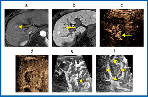 図7は,B型肝硬変に合併したS5,49mmのHCC症例である。造影CT(図7 a,b)では均一な腫瘍濃染と染まり抜けを認め,HCC典型例と診断された。Bモード(図7 c)では腫瘍の内部エコーレベルは高く,そのため従来法の造影3D(図 7 d)では腫瘍内血管は不明瞭であった。一方,造影SMI(図7 e)では腫瘍内血管が描出され,造影Smart 3D(図7 f)では腫瘍血管の連続性が向上し,きわめて高精細な腫瘍内血管像が描出された。