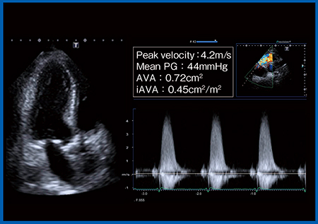 症例は,87歳,男性,高度大動脈弁狭窄症である。既往歴として,腹部大動脈瘤(AAA),狭心症(PCI施行),高血圧,糖尿病があり,AAA術後のため他院通院中に労作時の息切れが出現し,精査目的で当院を受診した。経胸壁心エコー(図1)では左室駆出率(EF)は保たれているが,大動脈弁最大血流速度(peak velocity):4.2m/s,平均圧較差(mean PG):44mmHg,大動脈弁口面積(AVA):0.72cm2,弁口面積係数(iAVA):0.45cm2/m2と,いずれも高度であった。また,CTにてAAAを評価すると,中枢側に大きなAAAが残存しており,蛇行もきわめて強かった。これらの結果から,本症例は,Logistic Euro scoreは25.8%,STS scoreは10.8%と,大動脈弁置換術(AVR)のサージカルリスクがきわめて高かった。