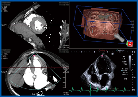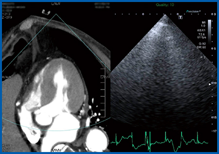 また,4chamberから2chamber,3chamberへと回してスキャンすることは,若手の技師はもとより,われわれにとっても難しいことである。しかし,Fusion Imaging(図4)を用いることで,2chamberではしっかり右室が消えるところを描出する,あるいは左心耳が見える断面であるといったことをCT画像と同期して見せられる点も,非常に有用と考えている。