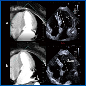 実際に,心尖部を適切に描出できた画像(図3 a)とできなかった画像(図3 b)を比較してみると,適切な画像では弁輪部からの距離が7cm,適切でない画像では6cmと,10%以上のズレがあった。こうしたズレは,左室容積やEFの計測結果の大きな誤差につながるため,2つの画像の違いをしっかりと確認できることは大変有用である。