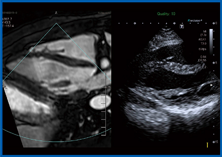 なお,Smart FusionではMR画像とのFusionも可能であり,CT造影剤が使用できない症例などで有用である。実際にFusionしてみたところ,空間分解能に優れたMRIと比較すると,超音波では左室壁などが分厚く描出されていることがわかり(図8),注意を要することが理解できた。