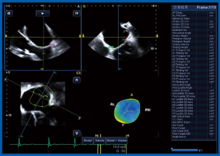 図9は実際の画像であるが,僧帽弁が明瞭に描出されている。Bモードもきれいに描出されており,カラー3Dドプラも含めて,SHDの評価に十分な画像が得られている。さらには,僧帽弁解析ソフトウエアも登場しており(図10),東芝メディカルシステムズ社の3D TEE技術は大きく進化していると思われる。