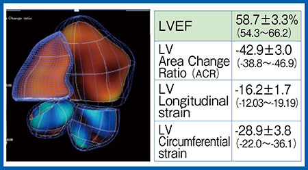 3D心エコーは,心臓全体のフルボリューム画像を収集解析することにより,2D心エコーよりも左室容量やLVEFをより正確に評価可能である。さらに,局所の内膜面の面積変化率を解析するArea Change Ratio(ACR)は,長軸方向への伸展(longitudinal strain)と円周方向への伸展(circumferential strain)の両方の心筋運動情報を反映する指標である。これを用いて3D-WMTの左室機能評価について検討した。
