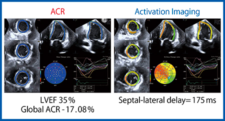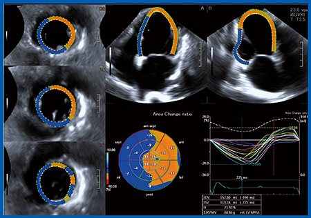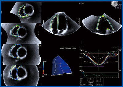 拡張型心筋症は,左室拡大し左室収縮能が著明に低下する左心系疾患であるが,重症例では右室機能も低下する。このような疾患では,Aplio iシリーズの進化した3D Speckle Trackingにて同一心拍で四腔を同時に撮像するQCTで,左心と右心機能,および両心機能の関連などの評価が可能となる。