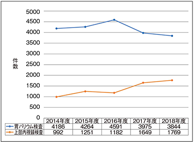 一方で、上部内視鏡検査は、2014年度の992件から2018年度は1769件と、ほぼ倍増している。