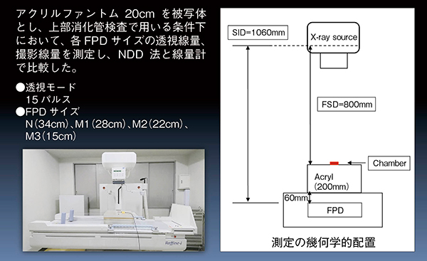われわれは、Dose-ManagerのNDD法での線量計算による線量計算値と、線量計の線量比較実験を行った。使用装置はRaffine-iで、使用物品は線量計が「Cobia」(RTI Electronics社製)、ほかに20cmのアクリルファントムである。方法は、アクリルファントムを被写体として、上部消化管検査で用いる条件下において、各FPDサイズの透視線量と撮影線量を測定し、NDD法での線量計算値と線量計の測定値を比較した。パルス透視のフレームレートは15fps、FPDの視野サイズはノーマル(34cm)、M1モード(28cm)、M2モード(22cm)、M3モード(15cm)とし、図4のように測定の幾何学的配置を行った。