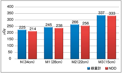 撮影線量の測定結果とその比較を図5に示す。青色の棒グラフが線量計の測定値で、赤色の棒グラフがNDD法の線量計算値である。各視野サイズにおいて、線量計の測定値とNDD法の線量計算値はいずれも同等の値を示し、NDD法の線量計算値と線量計で測定した入射線量との差はいずれも5%以内であった。これらの結果から、Dose-ManagerのX線照射線量レポートの信頼性は非常に高いと言える。
