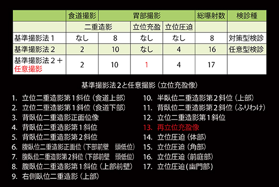 図6は、当院健診センターにおける基準撮影法と検診種である。当院では、基準撮影法2に、任意撮影として立位充盈像を追加し、13枚法、総曝射数17回としている。