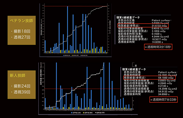 図9 ベテラン技師(上)と新人技師(下)のX線照射線量レポートの比較