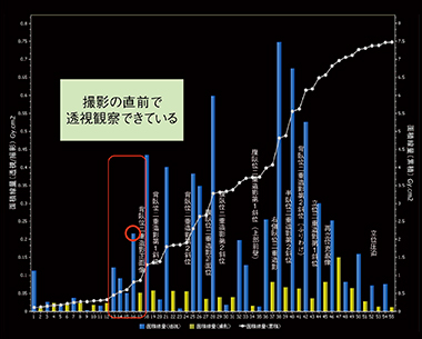 指導から3か月後のX線照射線量レポートでは、手技が改善され、撮影直前で透視観察ができるようになった(図10)。積算X線線量データは、積算線量(参照点)が40.9127mGy、透視積算時間が18.5640秒(=透視時間4分7秒)となり、大幅な透視時間の短縮が図れた。被ばく線量の低減のみならず、スループットが向上し、検査効率も改善した。