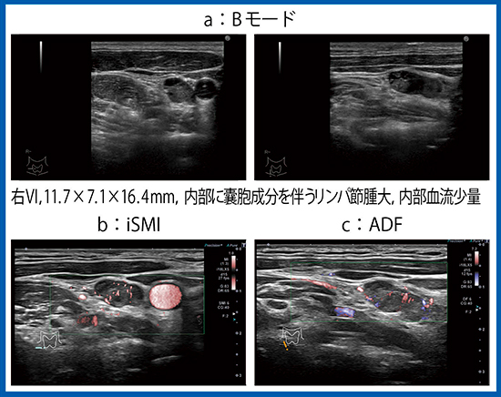 症例6は甲状腺乳頭癌術後4年目の精査である。内部に囊胞成分を伴うリンパ節腫大があり(図12 a),iSMI(図12 b)とADF(図12 c)にて内部に少量の血流が認められ,リンパ節転移であった。