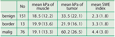 SWEの弾性率は組織の硬さが絶対値で表示されるが,再現性の乏しい値であることが知られていた。一方,筋肉の弾性率は安定しているため,筋肉をコントロールとして,当院の良性病変(151症例),境界型病変(13症例),悪性病変(76症例)について,それぞれのSWE indexを算出した(表1)。mean SWE indexは,良性:2.3,境界型:3.3,悪性:4.4と段階的に上昇しており,明瞭に分かれている。カットオフ値は3と4の間ということになるが,4以上であればかなり硬い組織であると判断できる。症例4のSWE indexは5.4と,かなり硬い組織であることから,確実にがんであると判断できる。