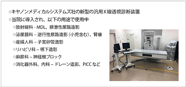 Astorex i9は、キヤノンメディカルシステムズ社製の新型汎用X線透視診断装置である。当院に導入後、放射線科や泌尿器科、産婦人科、リハビリ科、麻酔科、消化器外科、内科など多くの診療科で、多目的に使用している(図1)。