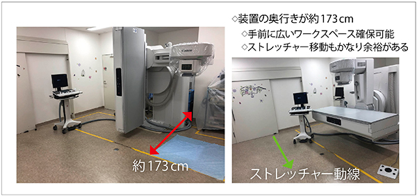Astorex i9は、装置の奥行きが約173cmと小型な上、壁に密着して設置できる。そのため、手前に広いワークスペースを確保することが可能となり、ストレッチャーの移動も容易になった(図2)。