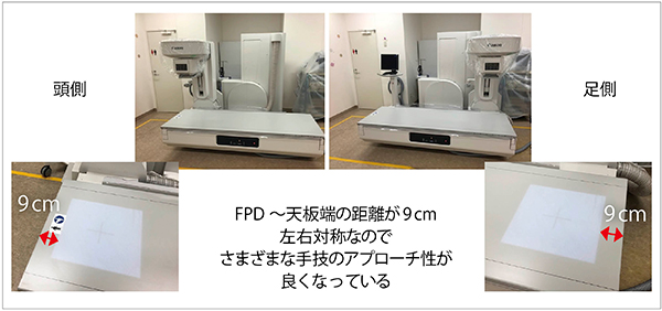 また、装置の可動域が広がったことで、手技のアプローチ性が向上している(図3)。Astorex i9はほぼ左右対称のデザインで、頭側、足側ともにFPDを天板端から9cmの位置まで移動が可能である。加えて、後半で紹介する“i-fluoro”機能を併用することで、拡大観察でも天板端から9cmの位置まで観察可能となり、各診療科からも好評を得ている。