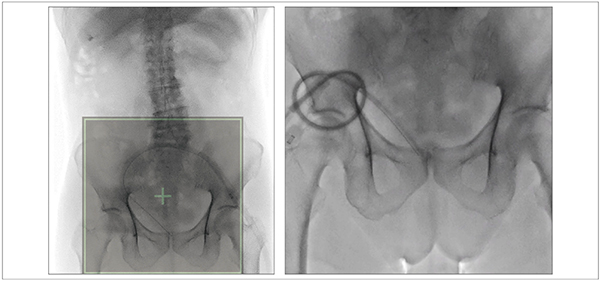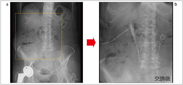 図8は、右腎瘻のカテーテル交換症例である。全体像(図8 a)から患者を移動することなく、右腎の一部を拡大し、カテーテル交換を行った(図8 b)。i-fluoro使用下での造影剤内のワイヤーやカテーテルの視認性も十分であった。図9は膀胱瘻造影症例で、i-fluoroを用いて骨盤部の拡大を行ったが、本症例も同様に必要な情報がきれいに視認できた。当院では、骨盤内の子宮卵管造影も行っているが、一度患者が天板に乗ると患者の移動が困難な検査の一つとして、i-fluoroの有用性を産婦人科とともに評価している。