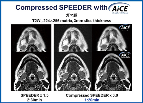 図1に,右頤部ガマ腫の症例を示す。同じ撮像条件で撮像した場合,PIでは2分30秒で撮像可能であるのに対して,Compressed SPEEDERでは1分20秒で撮像可能であった。また,Compressed SPEEDER単独では診療に影響しないものの,PIに比して若干ノイズが目立つが,AiCEを使用した場合には明瞭なノイズ低減効果を示している。