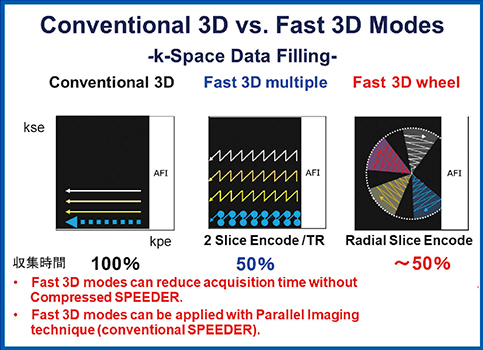 図2 従来の3D収集とFast 3D modeであるFast 3D multipleとFast 3D wheelのk-spaceデータ収集法の比較