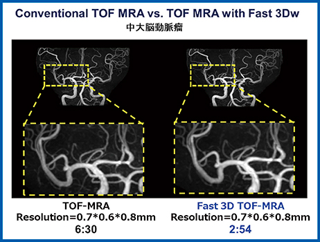 図3は右中大脳動脈瘤のMR angio-graphyであるが,同一撮像条件下にて通常のPIであるSPEEDERとFast 3D wheelにて撮像された。撮像時間はSPEEDERが6分30秒であるのに対して,Fast 3D wheelでは2分54秒で撮像でき,Compressed SPEEDERのようなノイズなども認められない。