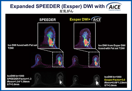図4に,SPEEDERによる左乳がんのDWIとExsperを用いて高空間分解能化したDWIの画像比較を示す。ExsperはSPEEDERと比較してコイル依存性が少なく,reduction factorを3倍まで上げることが可能になり,さらなる高分解能化を図るとともに,歪みも低減している。併せて,AiCEの併用によりSNRの改善なども行うことが可能である。