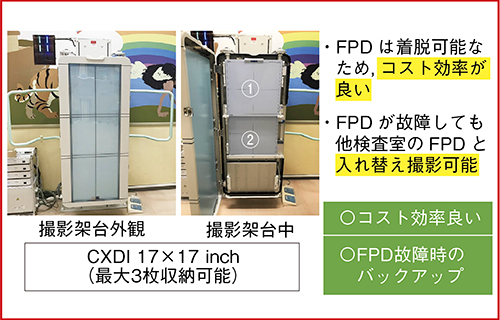 これらを改善するため,当院では長尺撮影立位架台「AS-S03」(オートシステム製)を導入した。AS-S03は,フルサイズ(17×17インチ)のフラットパネルディテクタ(FPD)であるCXDI-410CWを最大3枚収納可能である(図1)。FPDは着脱可能なためコスト効率が良く,故障しても他検査室のFPDと入れ替え可能でバックアップになるという利点がある。