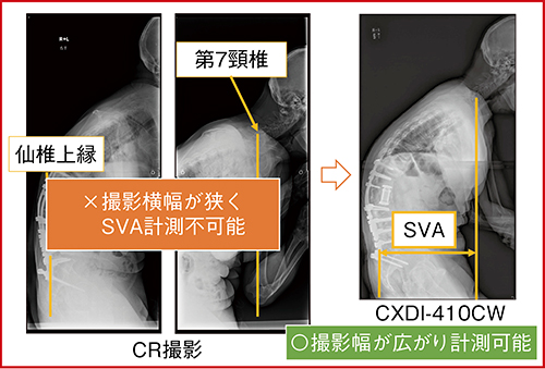 また,CXDI-410CWの撮影横幅はCRよりも5.6cm大きいため,後彎が強くCRでは1枚に収まらない患者でも,CXDI-410CWでは1枚でSVAの計測が可能となり(図2),撮影回数が減少する。さらに,撮影後の画像合成に要する時間が,CRの約110秒に対して,CXDI-410CWでは自動合成により約20秒に短縮した。これらの結果,CXDI-410CWではCRの3回撮影と比較し,撮影から画像表示までの時間が約240秒短縮するため,検査効率が向上し,患者の負担が軽減した。