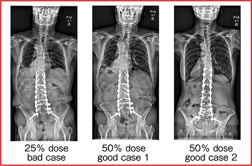 CXDIシリーズで使用可能な“アドバンスエッジ強調”は,ワンクリックで目的に応じた強調画像を作成する機能である。アドバンスエッジ強調を用いた全脊椎側面撮影では,従来画像処理の利用における撮影線量に対して,半分の撮影線量で臨床使用可能であることを示唆した報告もある2)。50%線量の全脊椎正面および側面の画像を示す(図3,4)。アドバンスエッジ強調を使用し,撮影条件の最適化を行ったところ,被ばく線量を50%低減でき,正面は0.23mGy,側面は0.66mGyで撮影可能であった。「日本の診断参考レベル(2020版)」(Japan DRLs 2020)のDRL値は,腰椎正面が3.5mGy,側面が9mGyであることからも,非常に低線量であると言える。