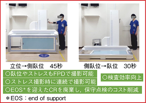 AS-S05は,寝台を電動で立位から側臥位や臥位に変更できるため,臥位撮影やストレス撮影をFPDで行うことが可能となった。これにより,ストレス撮影時のCRカセッテの入れ替えが不要となったほか,患者移動の負担が軽減し,また,画像表示までの時間が短縮したことで検査効率が向上した。さらに,サポートが終了したCRを廃棄することができ,保守点検のコストが削減された。AS-S03と同様に,FPDの故障時には他検査室のFPDをバックアップとして使用できることも利点として挙げられる。