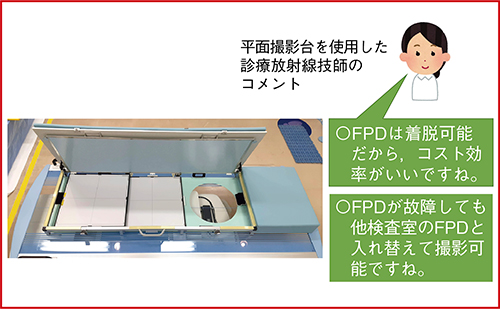 上記の課題に対し,当院では運用上の工夫による解決を試みた。患者の寝台への移乗時やベンディング時の腰の負担については,平面撮影台を寝台に乗せて行うことで解決できた。しかし,フルクラム撮影時に立位でFPDを入れ替えてからクロステーブル撮影を行うまでに45秒を要し,整形外科医から効率が悪いとの指摘があった。そこで,ストレス撮影時は他検査室からFPDを移動して,各装置に2枚ずつ,合計4枚使用することを提案したところ,FPDの入れ替えが不要で連続撮影が可能となり,検査効率が大幅に向上したとの評価が得られた。