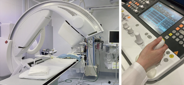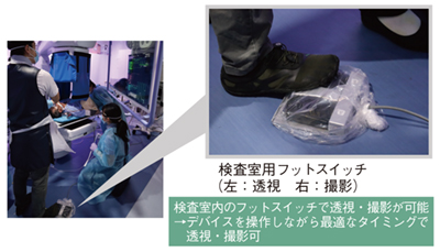 また、検査室内のフットスイッチで透視・撮影が可能である(図6)。従来、操作室にいる医師が透視・撮影を行っていたが、検査室の外からでは透視を行うタイミングの判断が難しく、X線を照射し続けたまま手技を行わざるを得なかった。しかし、フットスイッチを用いることで、術者がデバイスを操作しながら最適なタイミングで照射でき、最低限の透視時間で被ばくを抑えた検査が可能となる。