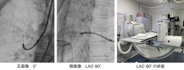 Ultimax-iのCアームはRAO41°〜LAO90°回転し、幅広い角度で観察できる(図2)。コンソール上にあるレバー1本のみで操作できるため、Cアームを直感的に動かすことができる。Cアーム型装置の導入前は担当医や介助者が被検者の体位を変換し、保持する必要があったが、Cアームを回転させることで被検者を動かすことなく病変部を観察でき、マンパワーの省力化にもつながっている(図3)。
