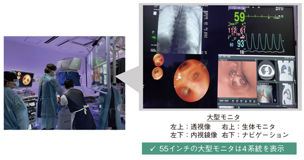 透視内視鏡室内の照明には可変色LEDを採用している。手技に応じて最適な明るさや色合いに調整することで術者の視認性が向上する(図4)。当科では通常、紫色に設定しているが、モニタ画面が観察しやすく術者の眼の負担を軽減するほか、被検者の心理的な安心が得られ、検査中の不安を和らげることが期待される。55インチの大型モニタは4系統の表示が可能で、内視鏡像、透視像、生体モニタ、ナビゲーション画面などを表示している(図5)。透視時は、ベストポジションの撮影像とライブ像を同時に表示・確認している。