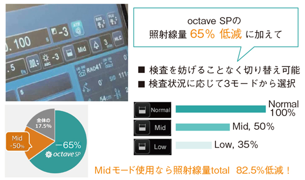 「octave SP」は、多重解像度SNRFなどの8つの技術で構成される高画質・低線量検査コンセプトで、従来装置より放射線量を65%低減する。