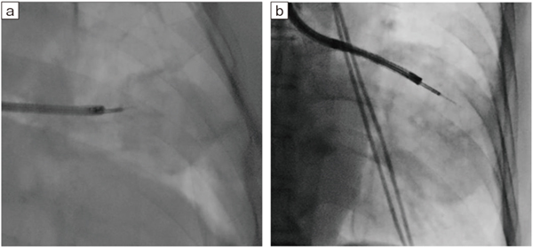 低線量の低いフレームレートでも、病変の位置確認やガイドシース先端の観察に十分な画像が得られている(Accent適用症例画像)。