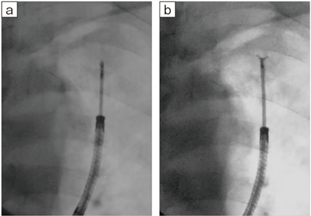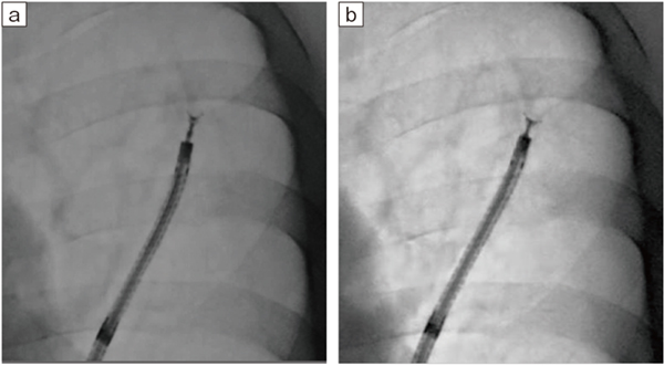 Ultimax-iに新たに搭載された画像処理条件Accentは、デバイスや造影剤を強調し、術者が見たい部分の視認性を向上する技術である。当院は、病変やデバイスの視認性の高さから、大半の症例でAccentを適用している。経気管支生検針(PeriViewFLEX、オリンパス社製)は透視下での視認性が若干低い場合があるが、Accentでは針の先端も明瞭に確認できる(図11)。