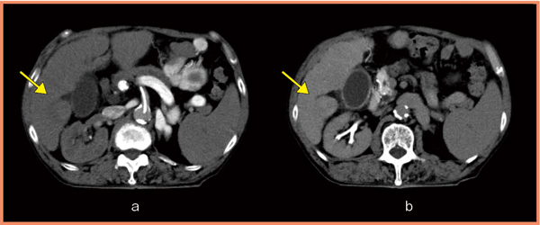 図4 肝細胞がんのCTAP(a)とCTHA(b)