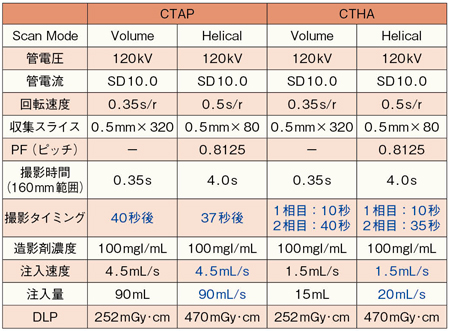 血管造影下のCT撮影は,検査の繰り返しによる造影剤の使用量や被ばくの問題が懸念される。実際に,4列のIVR-CTと320列のIVR-ADCTについて,CTAPとCTHAの撮影条件を比較した(図6)。スキャンモードは,4列はヘリカル,320列はボリュームで撮影している。撮影タイミングは,320列はCTAPについては若干遅めに設定しているが,これはADCTによるスキャン時間の短さを考慮している。造影剤の総注入量に差はないが,被ばく量はADCTの方が少なくなっている。CTAPでは,SMAから注入して静脈の還流を撮影するため,造影剤量の低減に限界があるが,CTHAではスキャン時間の短縮が造影剤減量に直結する。4列と320列では空間分解能の違いもあり,320列では造影剤濃度は150から100mgl/mLに,注入量はCTHAで30mLから15mLに下がり,被ばく線量(CTDIvol)も低減されている。