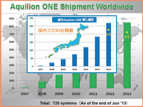 次世代CTの世界標準をめざす320列ADCT「Aquilion ONE」シリーズは2013年現在,0.35秒回転のGlobal Standard Editionと,0.275秒回転のViSION Editionを合わせて全世界で720台が稼働しており,国内はその32%にあたる230台になります。