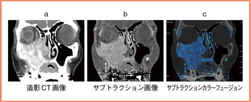 造影CTによる通常の軟部条件のみでは,中頭蓋底の骨破壊は明らかではないが,中頭蓋底の硬膜の肥厚が疑われる(図1a)。サブトラクション画像(図1c)では,MRIにおける脂肪抑制併用造影T1強調像のような画像が得られ,腫瘍が頭蓋底の骨髄を介して硬膜にまで達していることが観察できる。さらに,カラーフュージョン(図1d)することで,視覚的により明瞭な画像が得られる。