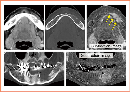 Aquilion ONEによるサブトラクションの特徴は,Volume Scanで行うことである。寝台を動かさずに撮影できるため,ヘリカルアーチファクトや慣性力による臓器のブレがまったくない,非常に高精度のサブトラクション画像が得られる。当院では,Volume Scan Subtraction技術を頭頸部がん診療に応用し,骨への浸潤の評価を行っている。一般的に,悪性腫瘍の骨浸潤に対する術前画像評価はCTとMRIが行われるが,皮質骨への浸潤評価はCTが有用であり,骨髄浸潤の評価などはMRIが勝るとされている。サブトラクション技術により,CTで骨髄腔などの腫瘍の浸潤診断精度が向上し,MRIに近い評価が可能になれば,臨床的にも有用度が高いと考える。