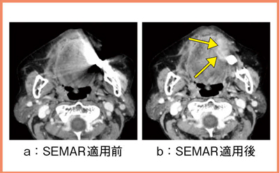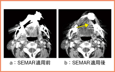 SEMAR適用前のCT画像(図5a)は,歯の充填物から生じる金属アーチファクトにより,腫瘍の存在診断は困難であるが,SEMARの後処理を適応すると,画質を劣化させることなくアーチファクトのみ低減され,左舌縁の病変を確認することが可能となった(図5b)。